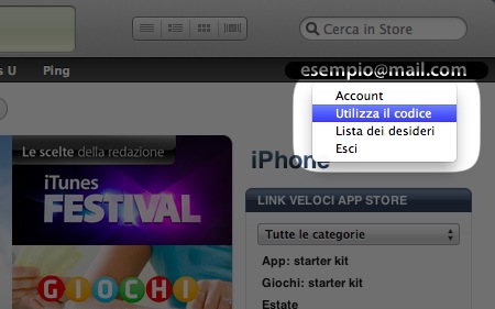 Recati nell'angolo in alto a destra e clicca sull'indirizzo email del tuo account Apple, poi clicca su Utilizza codice.